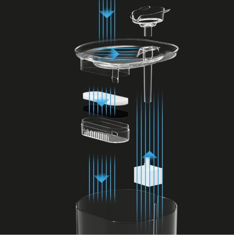 【The Solution】 Our filtered water for cats system utilizes a 4-stage fine filtration process: microporous cotton for hair, ion exchange resin to soften hard water, activated carbon to remove odors, and medical-grade fabric for fine particles.